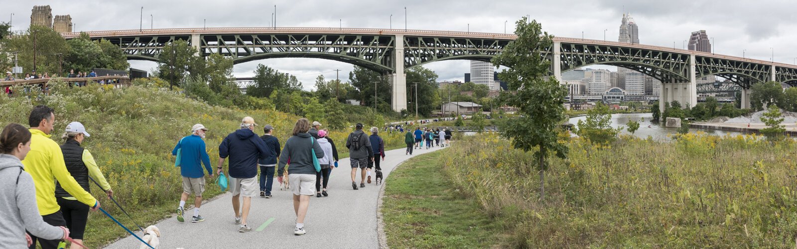 The Cleveland Foundation Centennial Lake Link Trail provides great views of downtown.“This is a way of activating one of our newest trails connecting downtown and the neighborhoods,” says Jacqueline Gerling, the Metroparks’ Director of Communications. “Folks can enjoy sweeping views of the city and the river and get a firsthand look at the newest section of the Lake Link Trail.”